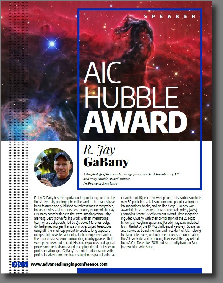 R. Jay GaBany, the author of Cosmotography, has been selected to receive the 2019 Hubble Award from the Advanced Imaging Conference during its San Jose, California meeting from November 15-17, 2019.