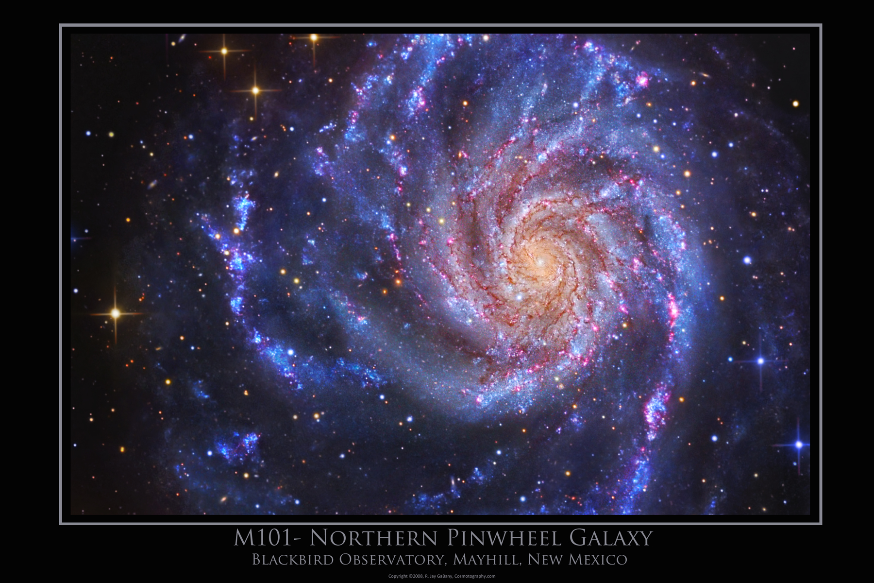 The M101- Northern Pinwheel Galaxy Special Edition PosterNow, you can own a personal copy of this Special Edition Print made from the master, full resolution image for only $24.99 plus shipping. It displays every detail of the 18 hour exposure that captures all the subtle true to nature hues that are seldom seen in pictures of this spectacular region of the night sky! This large 20 X 30 inch poster is a dramatic high resolution graphic that will look great in your home, at your office or in your private observatory!Order a copy for yourself or as a gift. It's available on heavy duty, fingerprint resistant Kodak Lustre Supra Endura paper that has the color saturation of glossy prints without the glare. Each poster will be personally signed by the author prior to being tube packaged for safe shipment. To order yours, click here. Your complete satisfaction is guaranteed or we will refund your purchase price (less shipping) with no questions asked. This image was produced with exposures taken through a RCOS 20- inch telescope and a SBIG STL-11000 camera 714 minutes Luminance, 120 minutes Red, 72 minutes Green and 162 minutes Blue (All 1X1) Image copyright ©2008 R Jay GaBany