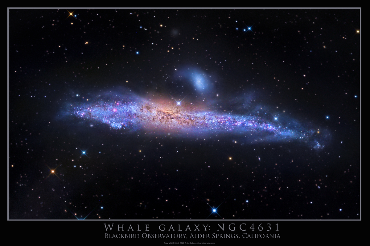 Whale Galaxy- NCG 4631- Special Edition PosterNow, you can own a personal copy of this Special Edition Print made from the master, full resolution image for only $24.99 plus shipping. It displays every detail of the more than 73 hour exposure that captures all the subtle true to nature hues that are seldom seen in pictures of this spectacular region of the night sky! This large 20 X 30 inch poster is a dramatic high resolution graphic that will look great in your home, at your office or in your private observatory!Order a copy for yourself or as a gift. It's available on heavy duty, fingerprint resistant Kodak Lustre Supra Endura paper that has the color saturation of glossy prints without the glare. Each poster will be personally signed by the author prior to being tube packaged for safe shipment. To order yours, click here. Your complete satisfaction is guaranteed or we will refund your purchase price (less shipping) with no questions asked. This image was produced with a RCOS half meter telescope, Apogee Alta U16M camera and Astrodon E-Series filters. Exposure times: 1,065 minutes Luminance, 120 minutes Red, 120 minutes Green, 120 minutes Blue (All 1X1) Image copyright ©2010-2015 R Jay GaBany