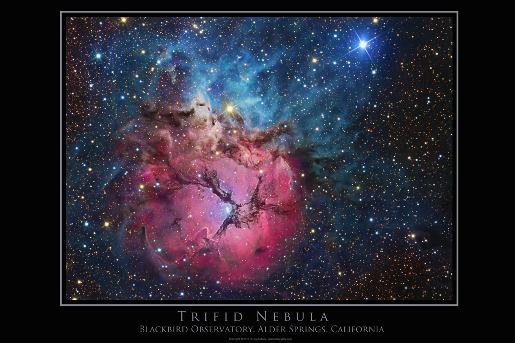 The Trifid Nebula Special Edition PosterNow, you can own a personal copy of this Special Edition Print made from the master, full resolution image for only $24.99 plus shipping. It displays every detail of the more than 12 hour exposure that captures all the subtle true to nature hues that are seldom seen in pictures of this spectacular region of the night sky! This large 20 X 30 inch poster is a dramatic high resolution graphic that will look great in your home, at your office or in your private observatory!Order a copy for yourself or as a gift. It's available on heavy duty, fingerprint resistant Kodak Lustre Supra Endura paper that has the color saturation of glossy prints without the glare. Each poster will be personally signed by the author prior to being tube packaged for safe shipment. To order yours, click here. Your complete satisfaction is guaranteed or we will refund your purchase price (less shipping) with no questions asked. This image was produced with exposures taken through a RCOS 20- inch telescope, Apogee Alta U16M camera and Astrodon E-Series filters 360 minutes Luminance, 120 minutes Red, 120 minutes Green, 120 minutes Blue (All 1X1) Image copyright ©2010 R Jay GaBany